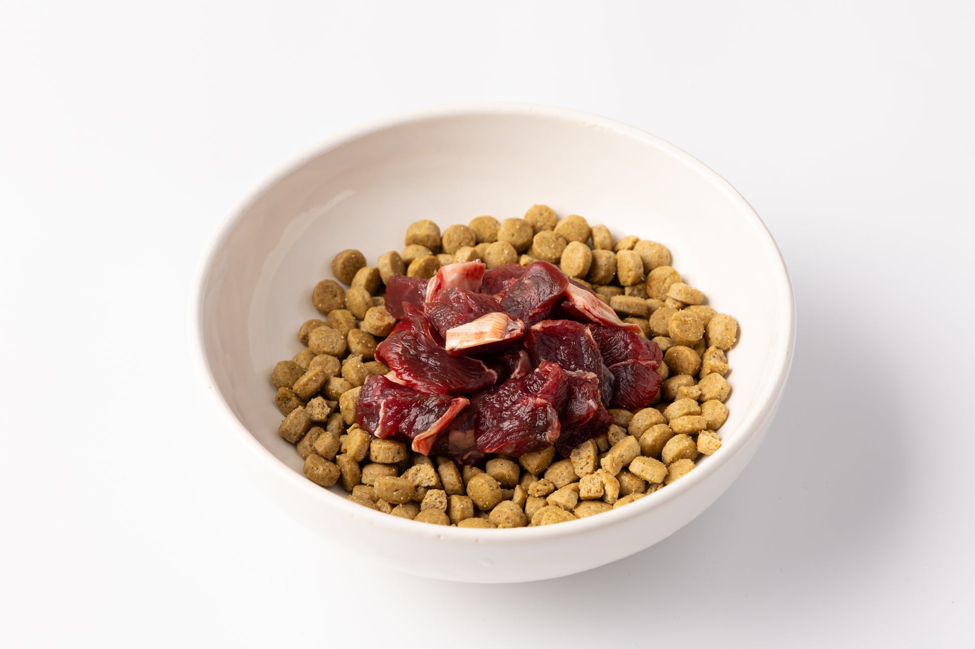 【与え方】 与える半日前に、使用分のみを冷蔵庫内で解凍してください。 初めての場合は、ティースプーン1杯くらいを今までのご飯にトッピングしてあげてください。 便の状態などを見て、少しずつ増やしていきます。  生肉だと食べない場合は、茹でたり焼いたりして火を通してあげてください。 慣れてきたら徐々にレアにし、最終的には生であげるのがおすすめです。